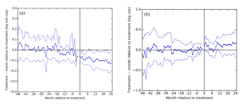 研究发现,能源审计干预对不同设备的节能措施采纳率提升都有积极作用,并且随着干预时间增加,企业采纳建议的比例逐步增加,这意味着这些设备的节能潜力得到有效挖掘(图2)。从干预效果来看,能源审计对企业的能源消耗和用能成本产生了不同程度的影响,实验组企业单位用电成本平均降低了8%,但能耗没有显著变化。进一步地,图3展示了干预效果随时间的变化趋势,可以看出,左图中的单位用电成本在干预实施后呈现明显的下降趋势,而右图中电力消耗量的变化趋势则没有统计意义上的显著变化。值得注意的是,企业单位用电成本降低可能影响节能建议降低电力消耗量的效果。