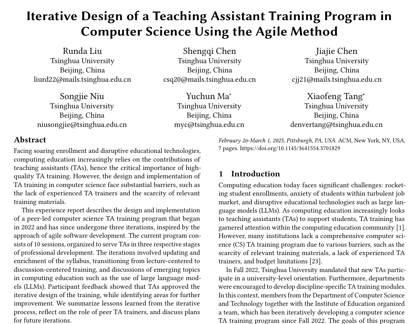 开云新闻网3月21日电 近日,第56届ACM计算机教育研讨会(ACM Computer Science Education Technical Symposium, SIGCSE TS)在美国匹兹堡举行。计算机系师生马昱春、陈晟祺(计63)、陈嘉杰(计72)、牛颂杰和教育研究院师生唐潇风、刘润达(教研硕22)合作完成的论文“对计算机专业助教培训项目进行敏捷的迭代设计”(Iterative Design of a Teaching Assistant Training Program in Computer Science Using the Agile Method)被SIGCSE TS 2025接收。论文第一作者为计算机系本科毕业生、教育研究院硕士生刘润达,共同通讯作者为计算机系教授马昱春、教育研究院副教授唐潇风。