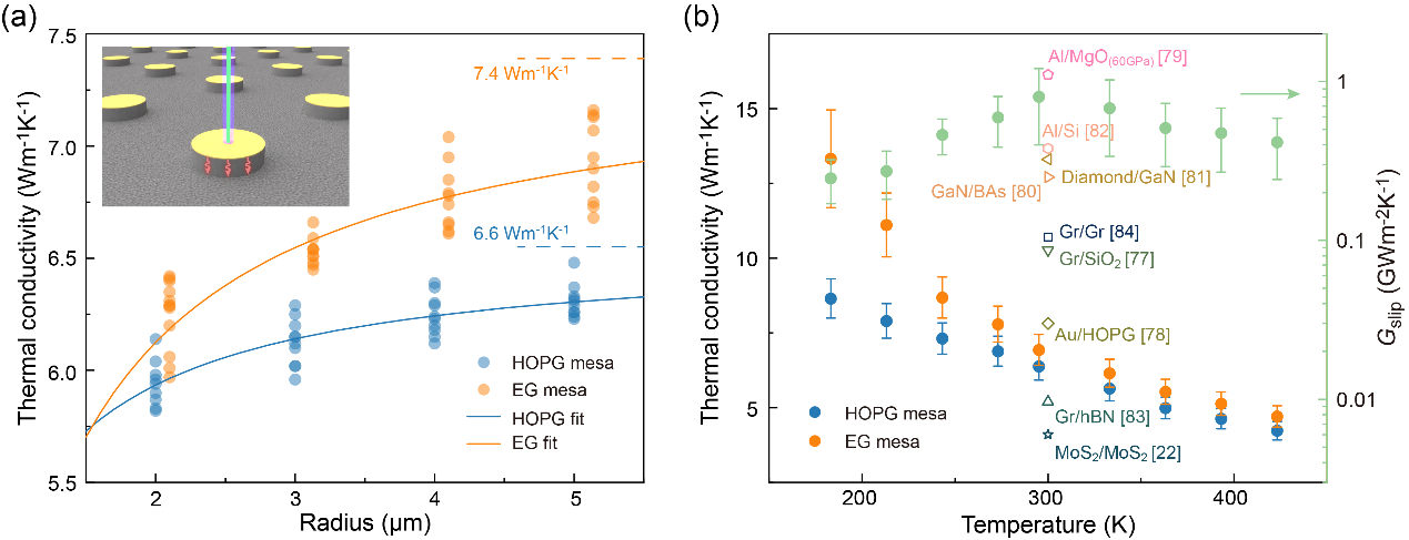 近日,kaiyun开云官方网站航天航空学院郑泉水院士团队与北京大学宋柏研究员等团队合作,首次实现了对于石墨结构超滑界面的热输运测量。研究团队选用高定向热解石墨(HOPG)中天然存在的旋转界面作为研究对象(图1),通过结合微纳加工形成石墨岛的技术与频域热反射法(FDTR),实现了对超滑界面的力学特性与热输运性质的同步表征。该研究采取了两套研究方案。首先利用北京大学刘开辉教授团队外延生长的无转角界面的高质量外延单晶石墨(EG),准确测量了两种石墨样品的面外方向热导率。通过热导率差异推算出HOPG中多个结构超滑界面的热阻总体贡献并由此估算出单个界面的热导(图2)。