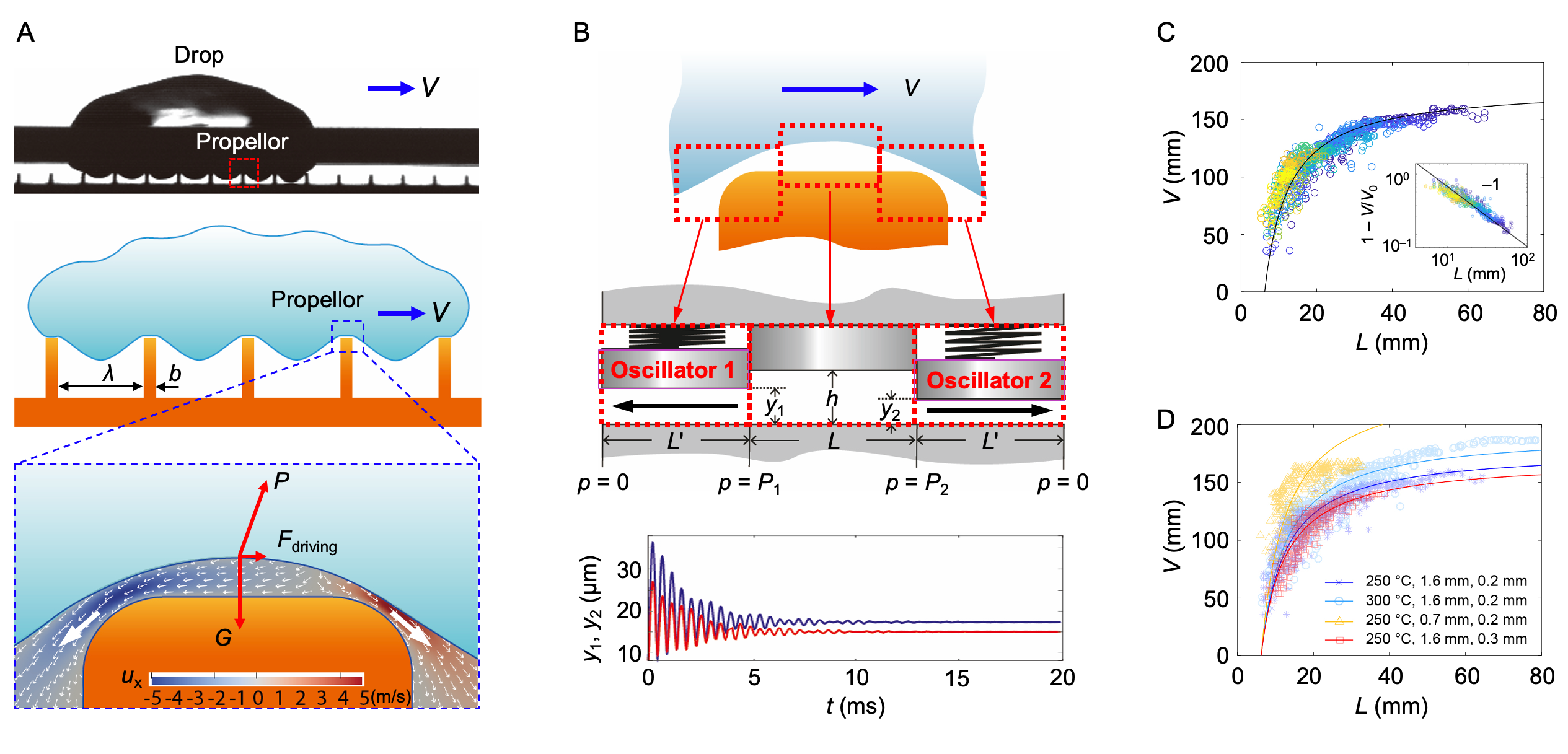 基于周期性对称的脊结构表面,研究人员通过实验观测和计算流体动力学模拟(图2A),捕捉了气-液界面动力学与蒸汽输运之间的耦合过程。研究发现,当液滴与热表面接触时,脊结构周围形成非对称的气-液流动,从而产生具有方向性的蒸汽压力,推动液滴沿特定方向运动。从更广义的角度看,这种现象被称为“自发对称性破缺”:一个最初对称的系统动态演化成一个对称性被打破的状态。该研究创新性地建立了气-液系统振荡理论模型(图2B),揭示了具有不对称性稳定振荡的气-液界面形成定向驱动力的机制,为自发对称性破缺诱导的自驱动行为提供了理论解释。特别值得注意的是,在该对称系统中,尽管在每个脊结构单元中产生的驱动力是独立的,但所有脊结构会自发形成方向一致的驱动力,使得自驱动行为不受制于液滴的长度。这一机制完全不同于传统非对称基底(图1B)依赖蒸汽粘性力的驱动方式。