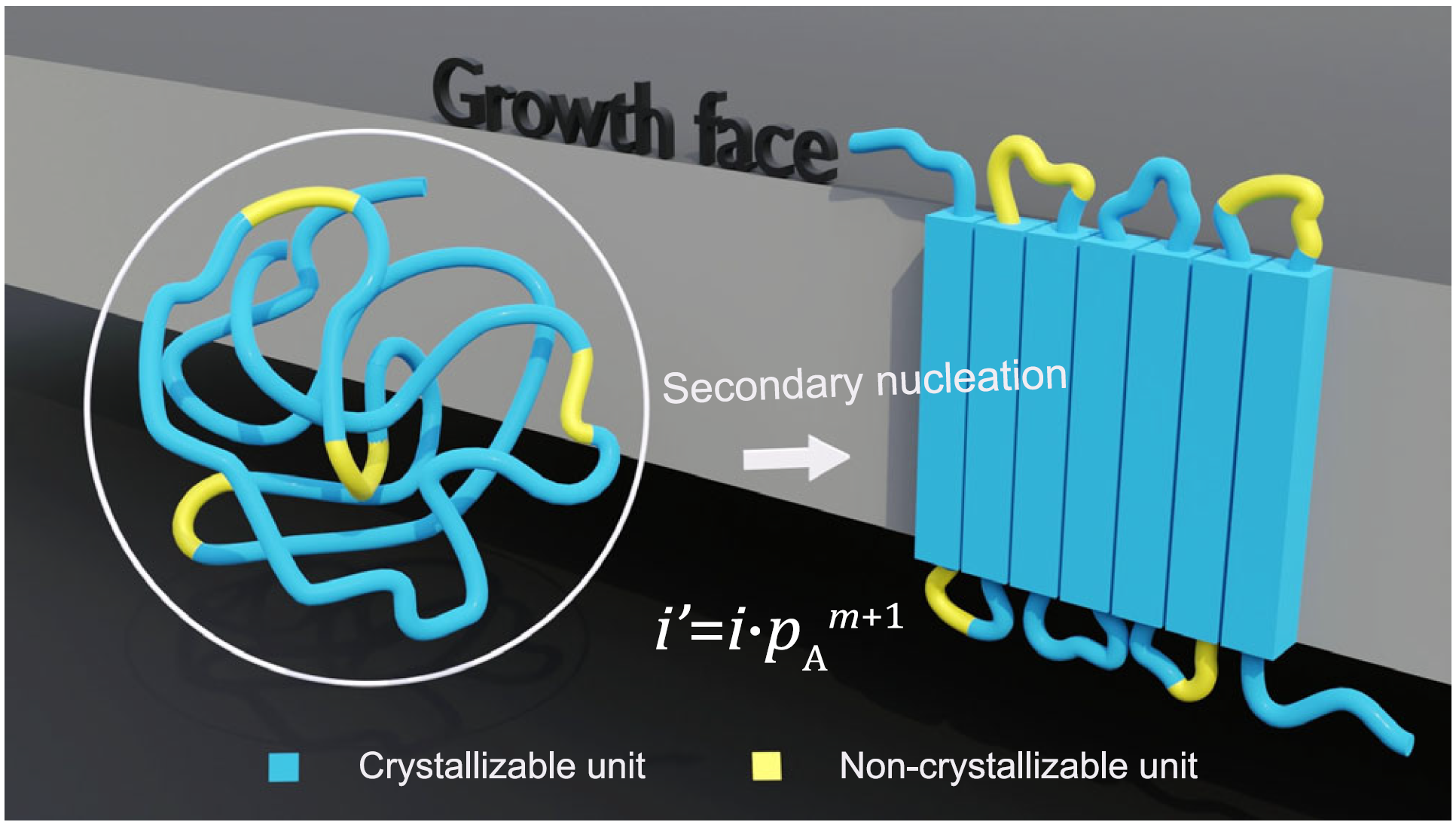 近日,kaiyun开云官方网站化工系徐军课题组基于无规共聚物结晶成核过程中对分子链上可结晶单元随机选择的概率模型(图1),建立了基于成核动力学测定临界晶核尺寸的理论方法,成功测定了稀溶液中聚丁二酸丁二酯单晶生长晶面上的次级临界晶核尺寸。