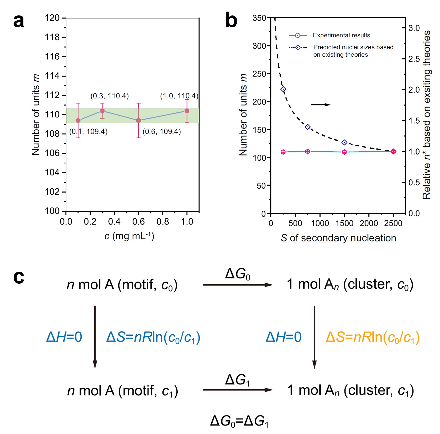 临界晶核尺寸的测定一直是一个巨大的挑战。实验上,虽然通过对成核过程的高分辨率实时观测揭示了关于成核的新认识,但是仍然难以通过对有限观测体积内各种晶核尺寸分布的统计获得准确的临界晶核尺寸。理论上,由于界面能等热力学参数很可能会随晶核尺寸变化,通过大晶体的热力学参数计算临界晶核尺寸会存在很大的偏差。此外,不同成核理论预测了不同的临界晶核尺寸。因此,迫切需要建立一种不依赖于难以验证的热力学假设(如单位体积的本体自由能变化和单位面积的界面自由能不随晶核尺寸变化)和复杂实验工具的方法来测定临界晶核尺寸。