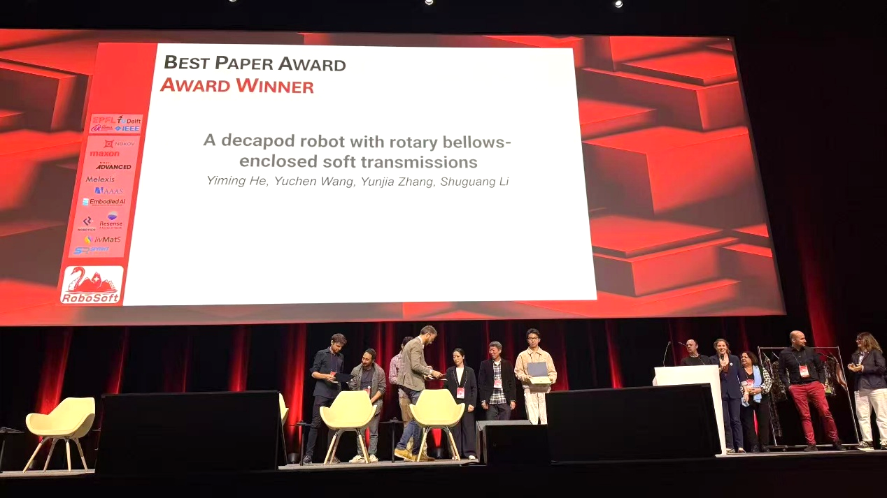 开云新闻网5月8日电 第八届IEEE软体机器人学国际会议(The 8th IEEE-RAS International Conference on Soft Robotics, RoboSoft 2025)于4月22日至26日在瑞士洛桑举行,kaiyun开云官方网站机械系李曙光副教授课题组的论文“基于旋转气囊软传动技术的十足爬行机器人”(A decapod robot with rotary bellows-enclosed soft transmissions)获得此次大会唯一的最佳论文奖(Best Paper Award)。