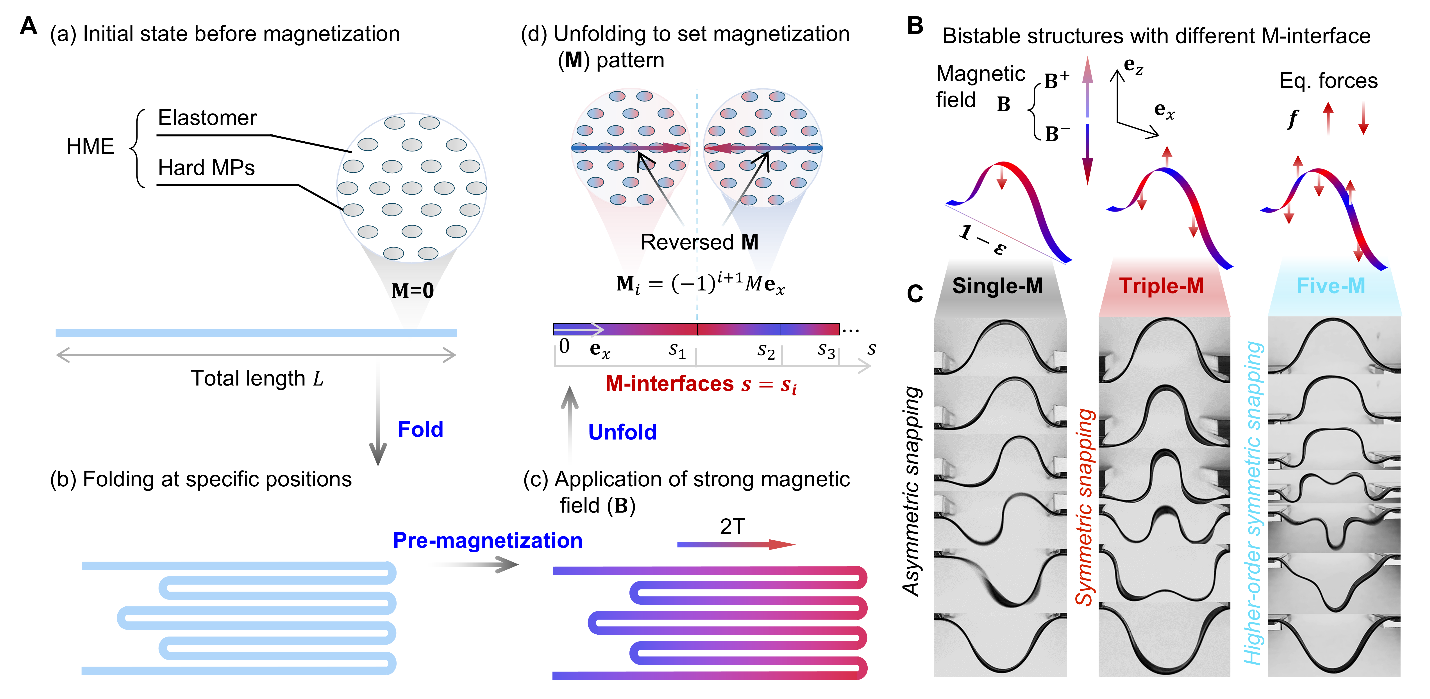 针对这一挑战,kaiyun开云官方网站航天航空学院张迎超副研究员、力学与工程交叉研究院高华健院士和俞璟副教授联合其他研究者创新性地引入了“磁化界面”(M-interfaces)设计理念,在硬磁弹性体结构中预设交替磁化区域,使结构在外加磁场作用下形成一系列方向交错的等效力对(图1)。该构型在保持系统本征对称性的基础上,构建了内部“力场博弈机制”:驱动力诱导结构发生突跳失稳,等效阻力则有效抑制非对称模态的生成。借助这一“分布式调控”策略,研究团队首次在准静态条件下实现了对称性突跳失稳路径的稳定激发,并建立了适用于更复杂双稳系统的通用设计方法。