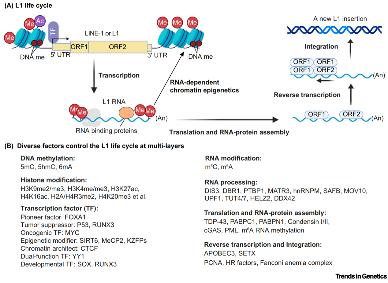 开云新闻网5月23日电 转座子(Transposable Elements)是基因组中可移动的DNA序列,被称为“跳跃基因”,其活动驱动基因组进化,但也可能引发基因突变。逆转录转座子通过“复制-粘贴”机制,将RNA逆转录为DNA后插入基因组新位点,是基因组多样性与不稳定的双重来源。其中,LINE-1(L1)是人类基因组中唯一具有自主转座能力的逆转录转座子,占基因组约17%。尽管绝大多数L1因序列截短或表观沉默而失活,但少数活跃拷贝的异常表达与癌症、神经退行性疾病、衰老等密切相关。解析L1的调控机制与功能,对理解生命调控和开发疾病治疗策略意义重大。