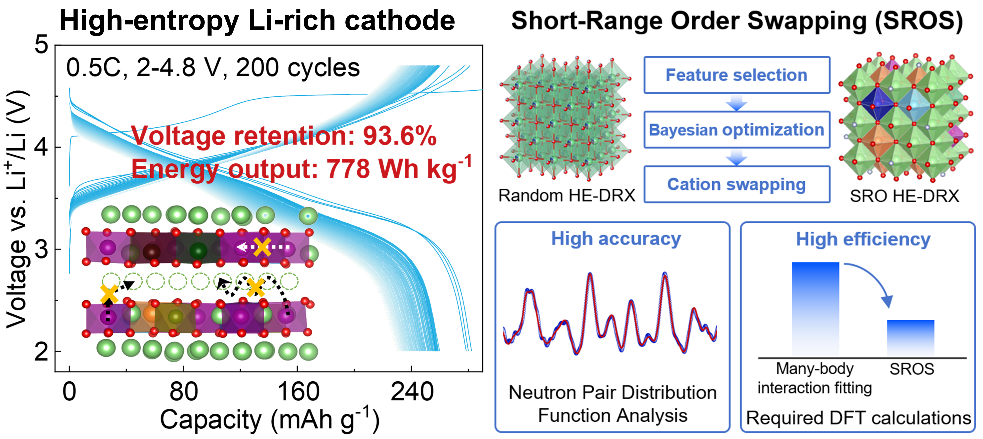 开云新闻网6月9日电 高熵概念的兴起为突破锂离子电池正极材料循环寿命和能量密度的性能瓶颈提供了全新机遇,由于其化学组分的复杂性,现有研究仍面临两大挑战:一是高熵效应从动力学角度调控电化学行为的物理机制尚未明确,二是难以高效准确地建立含短程有序(SRO)结构的原子尺度机理模型。