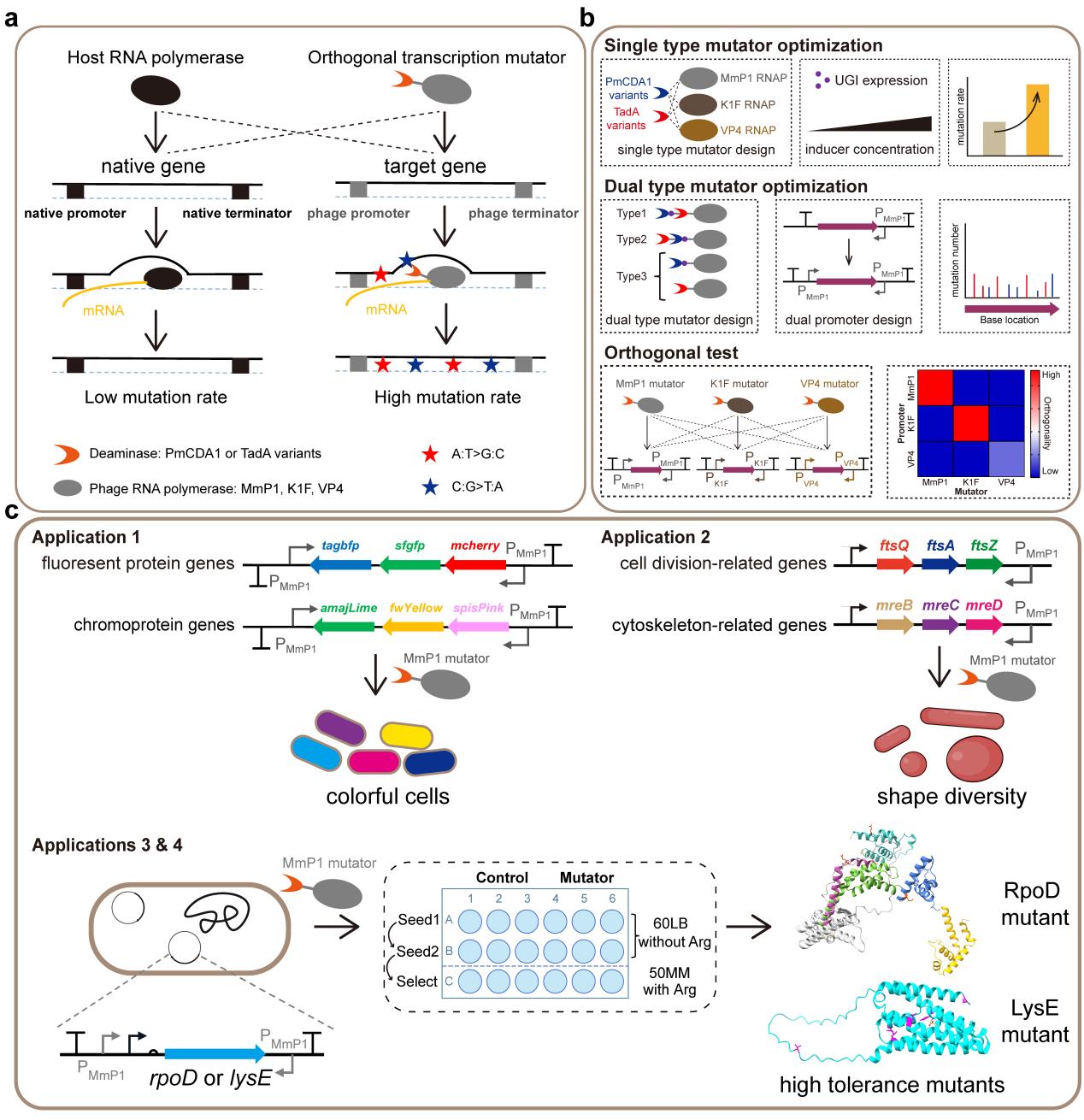 7月1日,kaiyun开云官方网站生命学院陈国强教授团队在《自然·通讯》(Nature Communications)发表题为“一种产生全部转换突变的正交转录突变系统用于体内加速蛋白质进化”(An orthogonal transcription mutation system generating all transition mutations for accelerated protein evolutionin vivo)的研究论文,报道了一种正交转录突变系统(OTM)。该系统通过将三种广宿主兼容性的噬菌体RNA聚合酶(MmP1/K1F/VP4)与两种脱氨酶(PmCDA1和TadA变体)巧妙融合,构建了一个高效、模块化的蛋白质进化平台。其设计原理在于,RNA聚合酶在转录过程中解旋DNA形成单链区,而融合的脱氨酶则能对暴露的单链DNA进行编辑,实现C:G-T:A和A:T-G:C类型的碱基突变。该系统能在短短一天内完成蛋白质的定向进化,突变效率较自发突变提升150万倍。