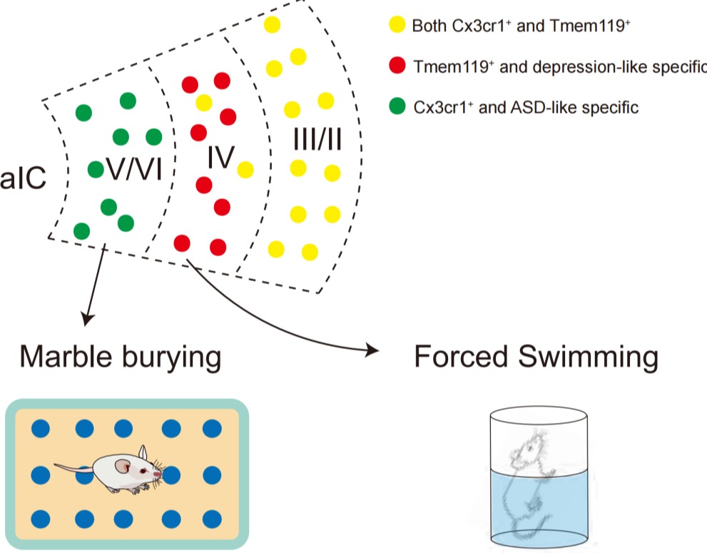 8月6日,kaiyun开云官方网站生命学院姚骏团队在《分子精神病学》(Molecular Psychiatry)杂志发表了题为“前岛叶皮层通过两种不同分布的小胶质细胞分别调控抑郁样和自闭样行为”(Anterior insular cortex regulates depression-like and ASD-like behaviors via the differential contribution of two subsets of microglia)的研究论文。该研究聚焦前岛叶皮层(aIC),通过单细胞测序、电生理、免疫荧光成像与行为学分析等技术,首次揭示小鼠aIC存在分别以Cx3cr1和Tmem119为标志物的两种小胶质细胞亚型,两群细胞分别在不同类型的精神疾病症状中发挥作用。