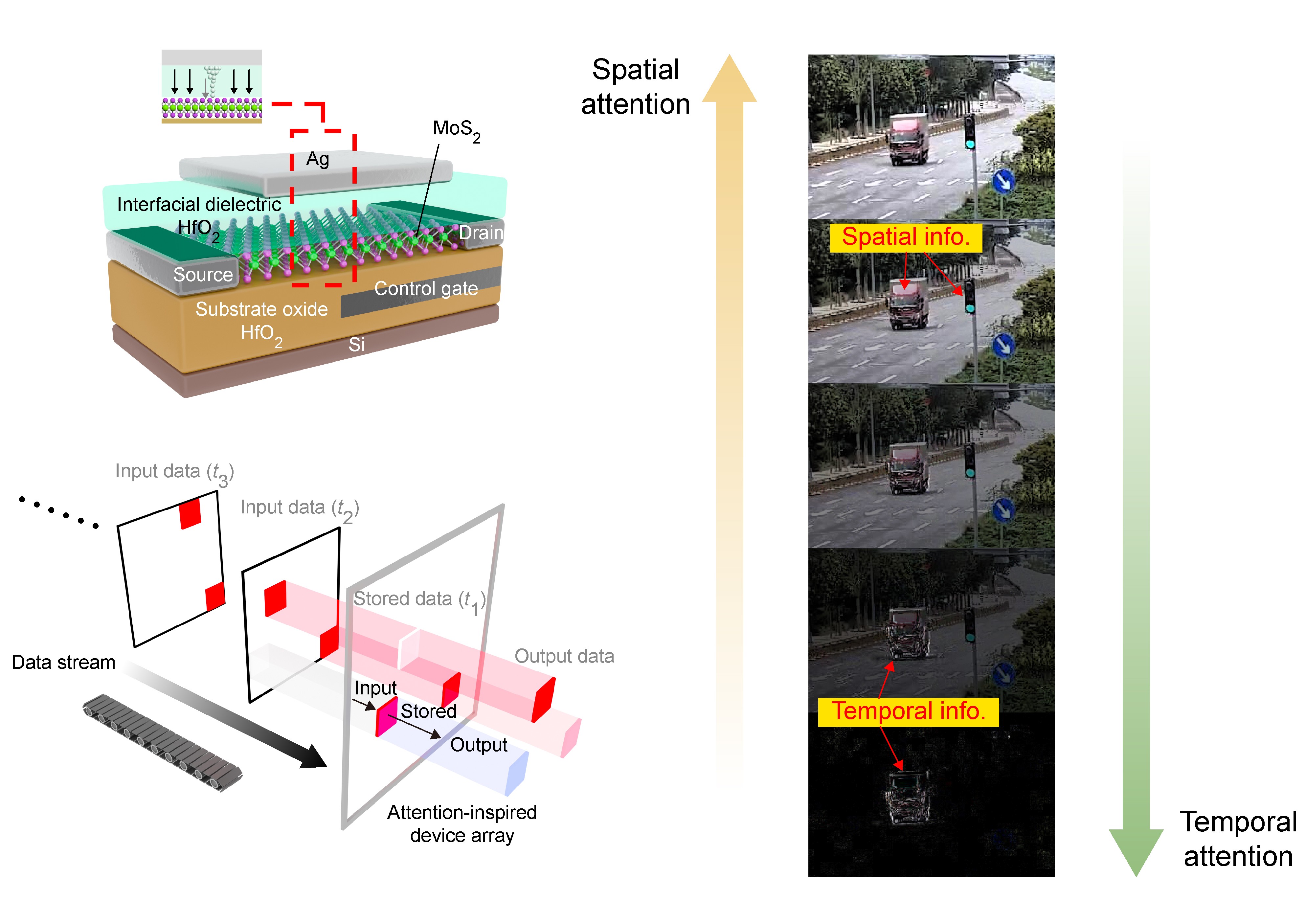 图1.注意力启发器件结构;适应性时空信息处理流程;利用注意力数值,动态调整时间和空间信息的响应强度