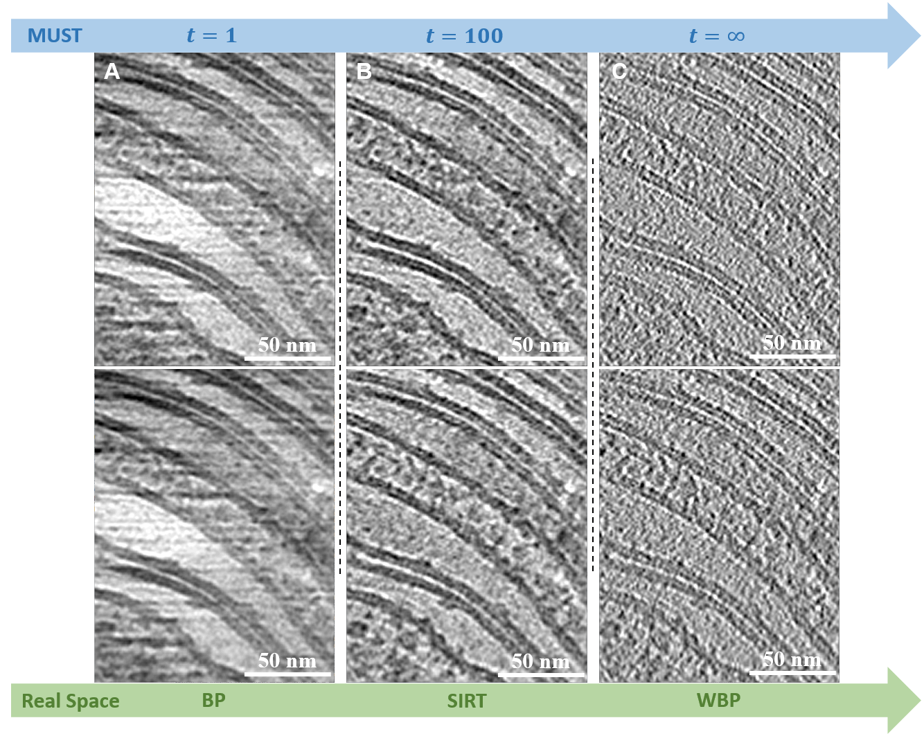 开云新闻网8月25日电 冷冻电子断层成像(cryo-electron tomography, cryoET)技术可以观察细胞中生物大分子的原位结构,近年来受到广泛关注。在cryoET的数据处理流程中,高质量的三维断层重建(tomogram reconstruction)对于展现样品整体形貌以及后续的子断层平均(subtomogram averaging)十分重要。虽然许多图像处理步骤都是在傅里叶空间(Fourier space)中进行的,但是由于断层重构的密度图(tomogram)尺寸非常大,实现基于傅里叶空间的重建依然存在挑战。因此,目前三维断层重建的常用方法仍为实空间(real space)方法,如加权背投影(weightedback-projection, WBP)、同步迭代重建技术(simultaneous iterative reconstruction technique, SIRT)等。
