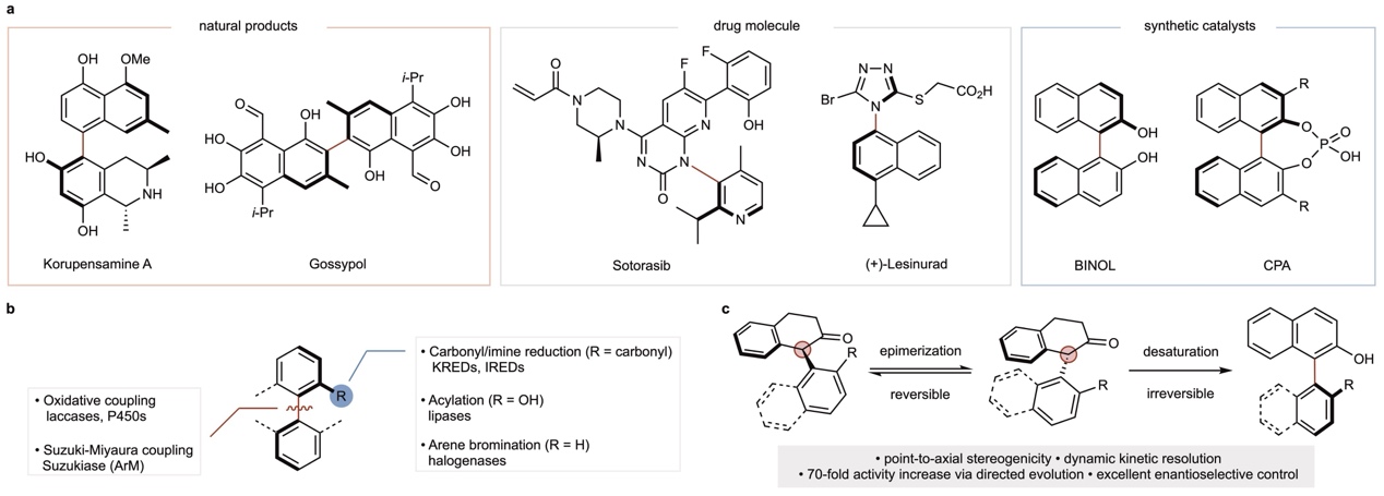 轴手性化合物的对映选择性合成主要有两种策略:一种是基于已有的(潜)手性轴,通过天然酶催化的不对称转化(如动力学拆分)来实现手性轴的选择性构建;第二种方法则是直接构建新的手性轴。尽管相关研究已取得重要进展,但总体而言,生物催化在轴手性骨架的构建方面仍局限于少数的逆合成策略和反应类型,与化学合成方法相比仍存在较大差距。