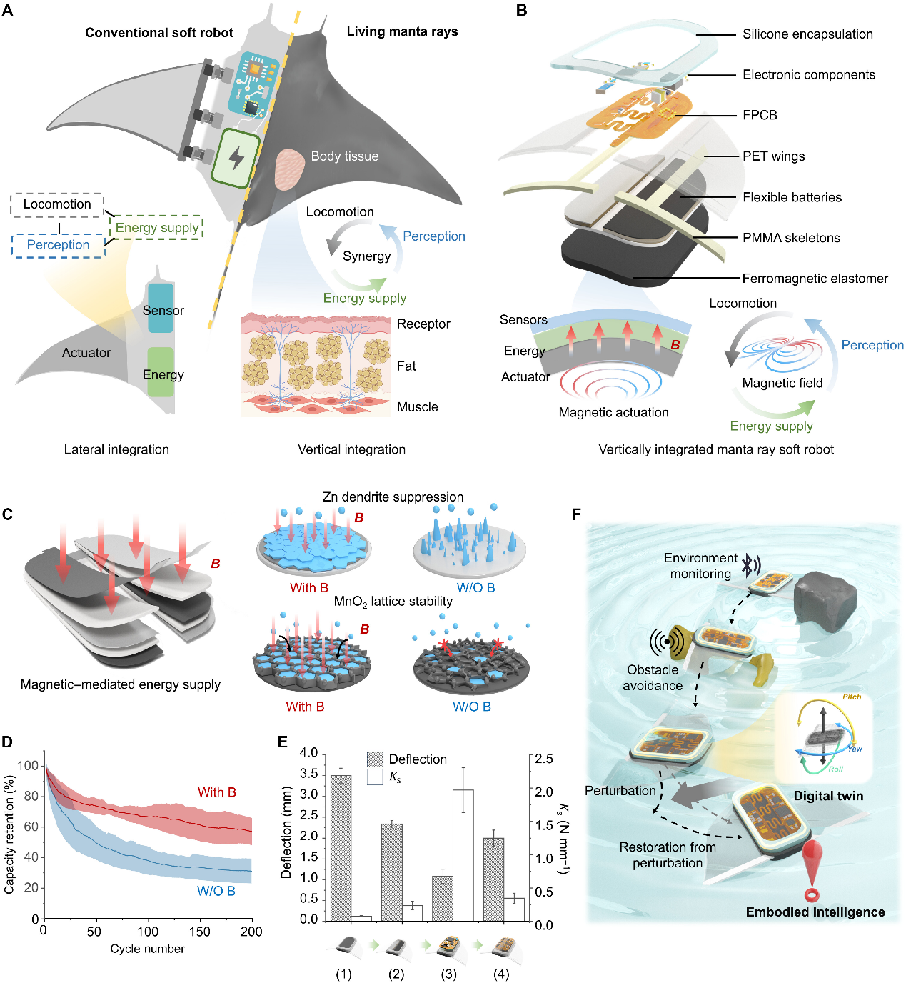 近日,kaiyun开云官方网站深圳国际研究生院丁文伯副教授所在的智能感知与机器人(Smart Sensing and Robotics, SSR)课题组与周光敏副教授课题组合作提出了一种磁驱动柔性电池集成机器人。该机器人集成的抗形变柔性电池,在机器人固有磁场增强下表现出优异性能,在200次循环后的容量保持率具有57.3%。这种柔顺电池可在机器人本体上实现44.9%的大面积部署,并通过与合理设计的柔性混合电路进行垂直集成,在保持可变形性的同时将额外刚度降至最低。这种执行器–电池–传感器的柔性垂直集成方法最大化了功能区域的利用率,并在仿鳐鱼软体机器人中得以实现,从而构建了一个具备感知、通信和稳定供能能力的无束缚平台。该系统在水下环境中展示了具身智能,包括扰动修正、避障和温度监测等多样化功能,并通过本体感知与环境感知实现了磁驱动运动过程中的实时决策。