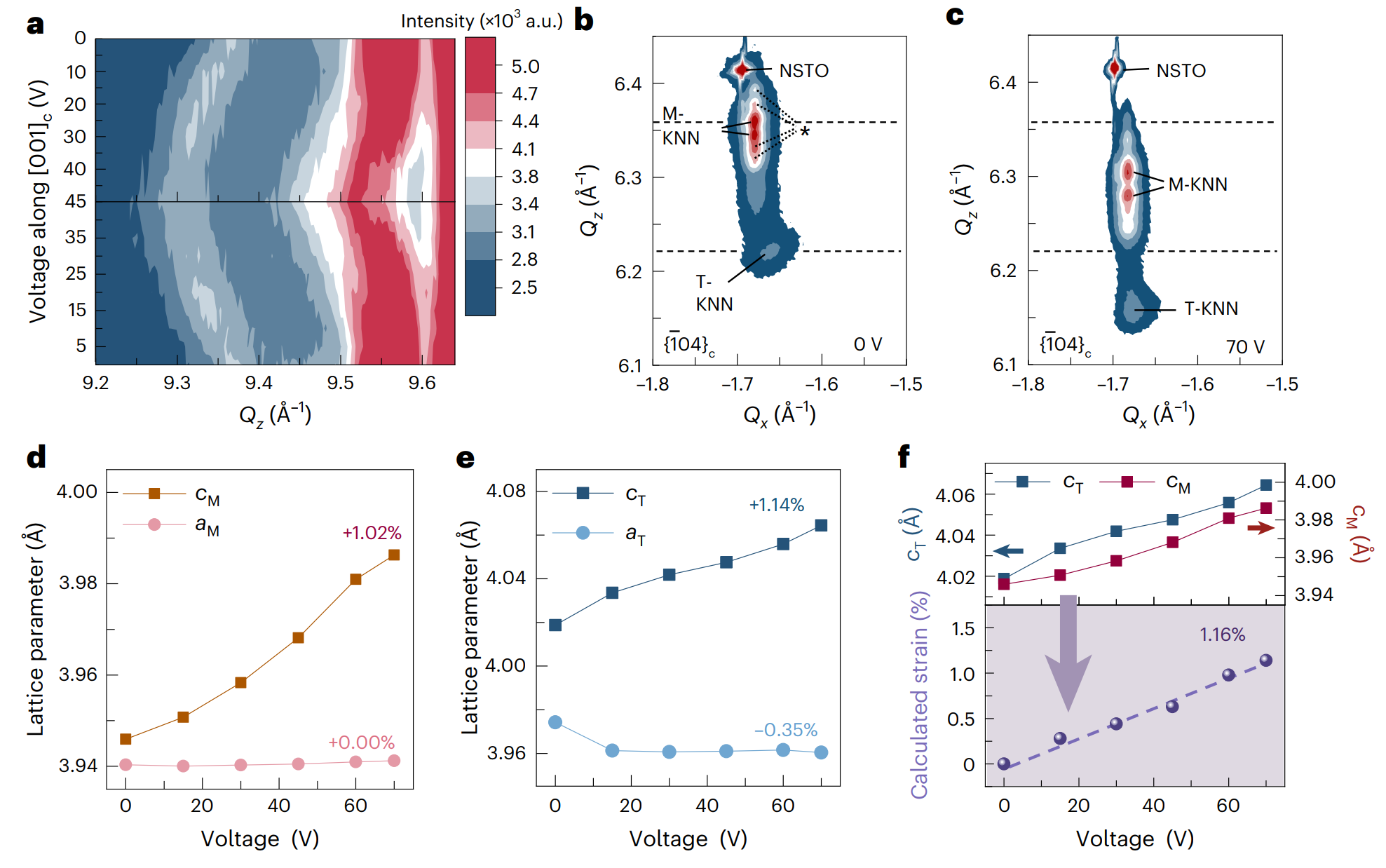结合原位电场同步辐射X射线衍射与相场模拟,团队进一步揭示了优异电致应变线性的起源。发现电场作用下M相与T相之间几乎没有相互转化,而微观晶格常数变化值(~1.16%)与实测宏观应变数值(1.14%)一致。M与T相区域各自的晶体衍射结果进一步揭示:不同对称性、边界条件的M和T相PNR中产生的两种极化切换机制,它们之间的协同互补效应进一步促进了薄膜的应变线性。