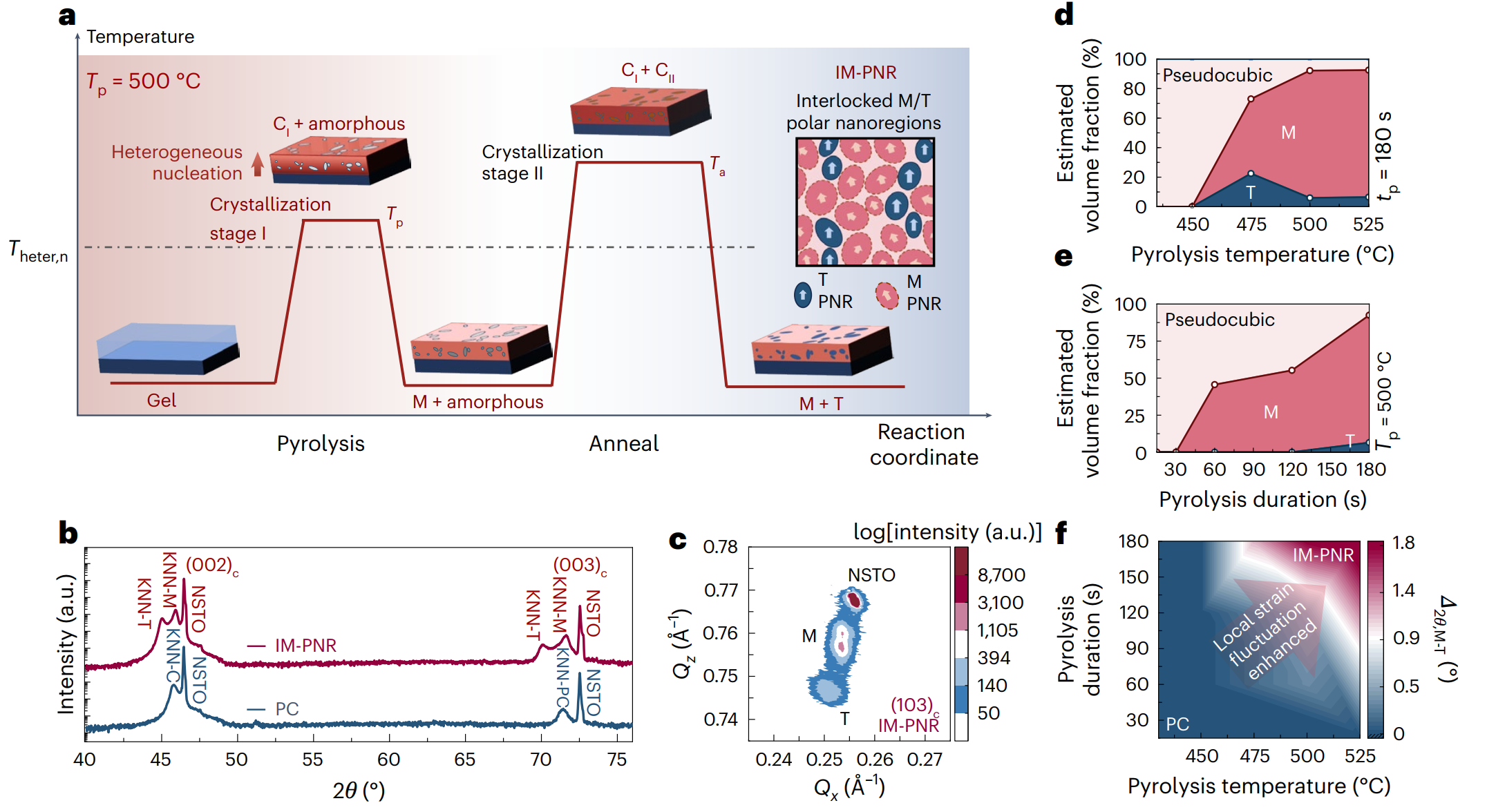 研究发现,在化学溶液旋涂法制备薄膜的过程中引入两步结晶工艺,可有效调控外延薄膜的结晶相组成和纳米极性微区结构(polar nanoregion,PNR)。在第一步结晶过程中,利用界面形核诱导的应力促进单斜(M)相的形成;随后,在更高温度的第二步结晶过程中,促使剩余非晶相完全结晶形成四方(T)相。通过精确调控热处理参数,可实现对薄膜中M相与T相体积分数的调控以及纳米极性微区尺度的优化,最终构建出具有显著增强局域应变效应的互锁单斜相纳米极性微区(IM-PNR)结构。