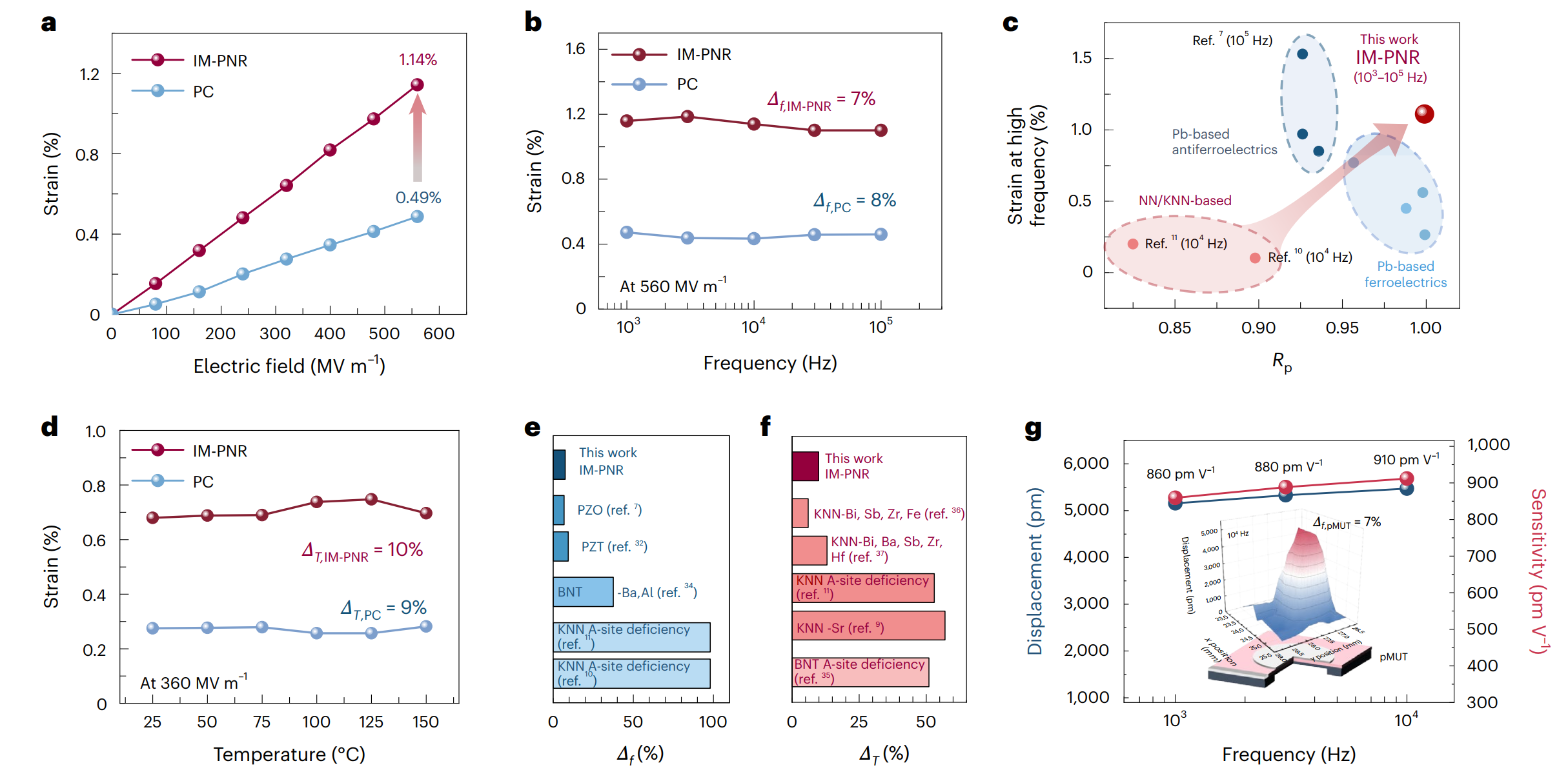 与传统一步结晶法制备的薄膜相比,基于两步结晶法获得的IM-PNR结构薄膜的压电应变超出2倍,同时维持了良好的应变线性,并具有了优异的频率与温度稳定性:在103至105Hz的频率范围内,应变变化率仅约7%;在25°C至150°C的温度区间内,变化率也仅为10%。基于此薄膜制备的pMUT原型器件也展现出高位移灵敏度和频率稳定性,证明了其在高频驱动应用中的巨大潜力。