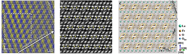 图1. iDPC-STEM图像给出LuFe2O4.22中间隙氧原子的有序排列。(a)[100]带轴下LuFe2O4.22的iDPC-STEM图像,黄色区域表示间隙氧存在的区域。(b)图(a)中白色曲线区域的放大图,黄色箭头标出了间隙氧的精确位置。(c)相应的原子结构模型示意图,蓝色小球代表间隙氧原子。