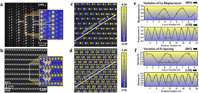图2. HAADF图像定量分析LuFe2O4.22中的点阵序参量。(a)[100]带轴下LuFe2O4.22的选区衍射结果,q代表超衍射点的调制矢量。(b)[100]带轴下的HAADF图像。(c)-(f)基于HAADF图像对Lu原子和Fe原子各自位移情况的定量分析结果。