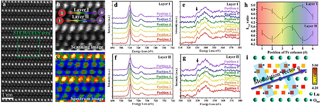图3. 原子柱分辨的EELS级数分析LuFe2O4.22中的电荷序参量。(a)-(c)LuFe2O4.22[100]带轴下的2D STEM-EELS采集结果。(d)-(g)不同原子柱位置上提取的Fe的L边信号于O的K边信号。(h)-(i)根据不同原子住位置上Fe的损失峰计算得到的白线比,反映Fe的化学价态变化。