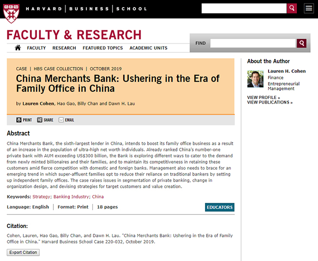 开云新闻网12月11日电 近日,kaiyun开云官方网站金融学院全球家族企业研究中心主任高皓与哈佛商学院知名教授、金融学国际三大顶尖学术期刊之一《金融研究评论》(Review of Financial Studies, RFS)主编劳伦·H·科恩(Lauren H. Cohen),以及哈佛商学院亚太研究中心副主任刘曦(Dawn Lau)、研究员陈嘉辉(Billy Chan)合著的案例《招商银行:引领中国家族办公室时代》(China Merchants Bank: Ushering in the Era of Family Office in China)被哈佛商学院案例库收录。此案例是第一篇被哈佛大学收录的亚洲私人银行案例,也是第一篇被哈佛大学收录的中国联合家族办公室(Multi-Family Office)案例。