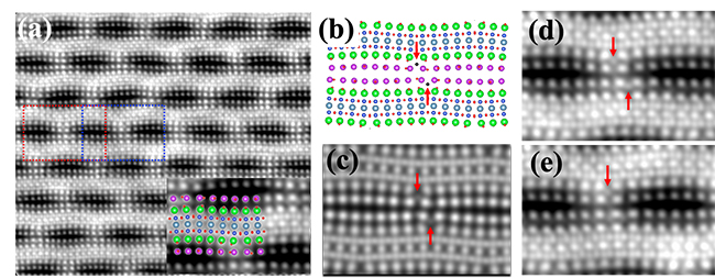 图1. 超导Bi-2212中掺杂氧原子的iDPC-STEM像 (a)Bi-2212[010]带轴的iDPC-STEM像 (b, c)Bi2212的原子结构模型和基于原子模型的像模拟 (d, e)掺杂氧原子在不同位置的不均匀分布。