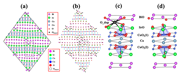 图2. 基于实验结果的掺杂氧原子Bi-2212结构的DFT计算:(a, b)有掺杂氧原子Bi-2212弛豫后的结构以及相对于无掺杂氧原子的原子位移图; 掺杂前(c)后(d)掺杂氧原子附近的局域原子结构。