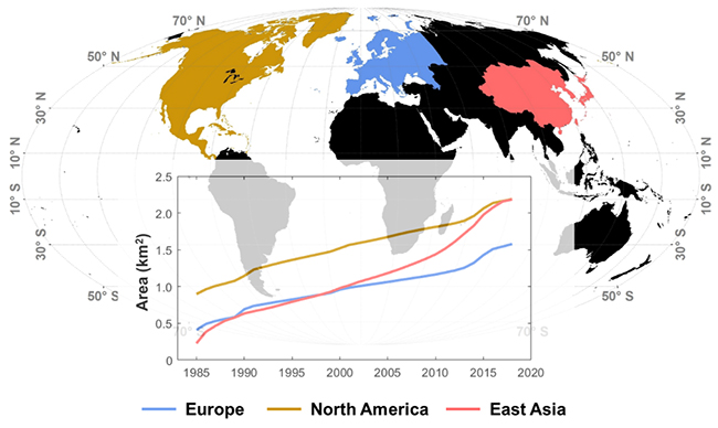 图1.长时序的不透水面面积变化(欧洲、北美和东亚)