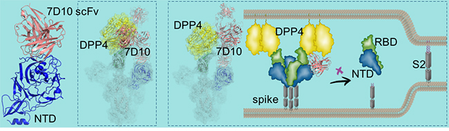 此次研究首先鉴定了MERS-CoV单克隆中和抗体7D10,这株抗体结合刺突蛋白的NTD,能够高效中和MERS-CoV假病毒、活病毒对细胞的感染以及高滴度假病毒对小鼠模型的感染。对NTD与7D10复合物的晶体结构测定以及位点突变研究揭示了一个位于刺突蛋白NTD上的全新表位。进一步研究表明,7D10的中和作用不只依赖于对DPP4结合的抑制,而且在病毒细胞附着后起作用,抑制膜融合前到膜融合后刺突蛋白的构象变化。这些特性使7D10对含有不同自然突变的MERS-CoV毒株具有广泛的中和能力,并与不同靶向RBD的中和抗体表现出协同作用或加和作用,为抗体药物与疫苗研发、防止MERS-CoV感染提供了新的理论依据和思路。