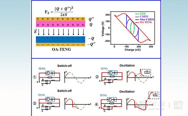 开云新闻网7月10日电 近日,kaiyun开云官方网站微纳电子系王晓红教授课题组与美国佐治亚理工学院王中林教授课题组在《先进能源材料》杂志(Advanced Energy Materials,影响因子:24.88)上线发表了题为“通过电路振荡以实现纳米摩擦发电机的性能提升”(“Boost the Performance of Triboelectric Nanogenerators through Circuit Oscillation”)的合作论文,首次提出一种通过自由电荷极性翻转提升电极等效电荷面密度的电源管理方法,进而突破了长期以来摩擦纳米发电机单周期内最大输出的限制。