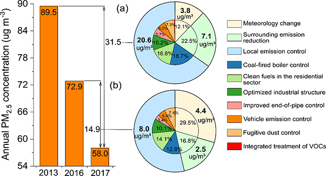 研究发现,尽管与2017年气象条件与2013年相比更有利于污染清除,但北京本地和周边区域的减排仍然是PM2.5浓度迅速下降的主导因素。本地减排、周边减排和气象条件变化对北京市2013-2017年间PM2.5浓度下降的贡献分别为65.4%、 22.5%和12.1%。在北京本地各项减排措施中,燃煤锅炉整治、民用燃料清洁化和产业结构调整是最为有效的三项措施(见图1)。气象条件变化对2016-2017年北京PM2.5空气质量改善贡献更为显著(约30%)。如2017年的气象条件与2016年一致,则北京2017年PM2.5年均浓度将增加至63μg/m3左右,超过“大气十条”设定的目标值。2016-2017年间,民用燃料清洁化、燃煤锅炉整治和产业结构调整是三项最为有效的减排措施。