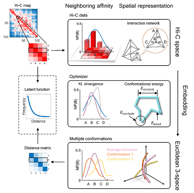 基因组在细胞核中以复杂的三维空间构象的形式存在,这种三维构象随着细胞状态和时间不断地发生动态变化,通常反映了基因组中不同区域发生相互作用的情况。三维基因组结构蕴含着非常丰富的信息,与细胞内绝大多数生物过程相关联,例如基因的转录、染色体的可接近性、DNA的甲基化以及表观遗传具有密切的关系,甚至有研究发现不同的基因组三维构象在疾病中作用也大不相同。因此,解析基因组的三维结构对研究基因调控有着重要意义。近年来,基于高通量测序技术(例如Hi-C)的三维基因组建模方法得到了广泛研究,然而大部分方法都依赖于对基因相互作用频率与染色体空间距离之间的关系进行假设。