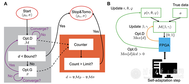 量子生成对抗网络(QGAN, quantum generative adversarial network) 基本原理与经典的GAN是一样的,区别在于这里生成器和判别器是由量子器件或者量子网络构成,训练用的数据集也可以是量子数据(如量子态等)。孙麓岩课题组与合作者在超导系统中首次实现了GAN,展示了从量子数据集中学习有用模式的可行性。在此实验中,生成器由一个能以一定概率分布产生量子态系综的超导量子线路组成,判别器是一个可以做投影测量的量子器件,训练用的真实数据集由一个量子通道模拟器产生。