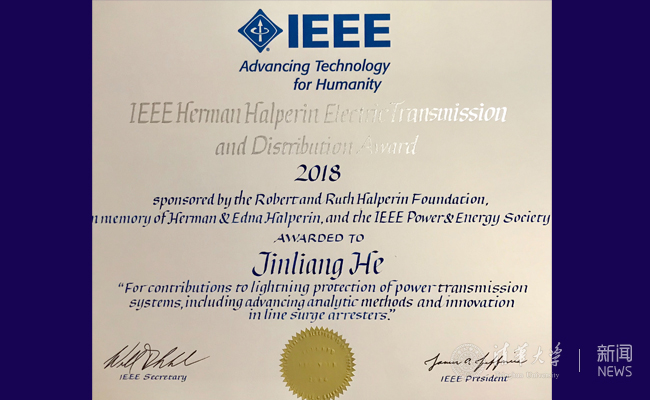 何金良教授获颁2018年IEEE赫尔曼·霍尔珀林电力传输和配电奖