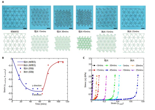 A图为网状材料吸水和脱水过程中的构型演变。B图为溶胀应变随时间演变的曲线图。C图为对应吸水/脱水状态下的应力-应变曲线。比例尺为40毫米