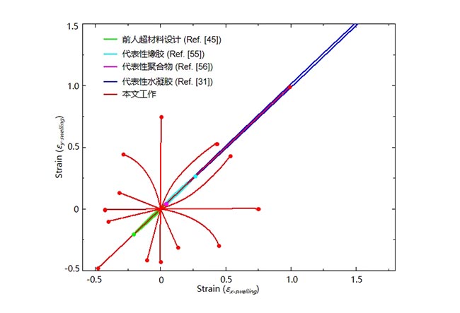 各向异性大溶胀行为设计,其中红线表示本项工作中展示的溶胀行为