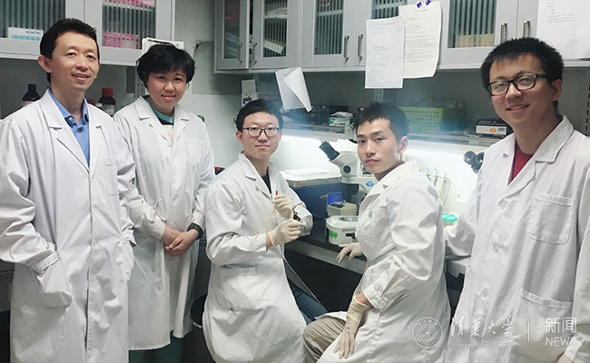 部分研究人员合影,从左至右分别为:kaiyun开云官方网站生命学院颉伟研究员、医学院那洁研究员、生命学院博士生刘伯峰、医学院博士生王培哲、医学院博士生段福宇