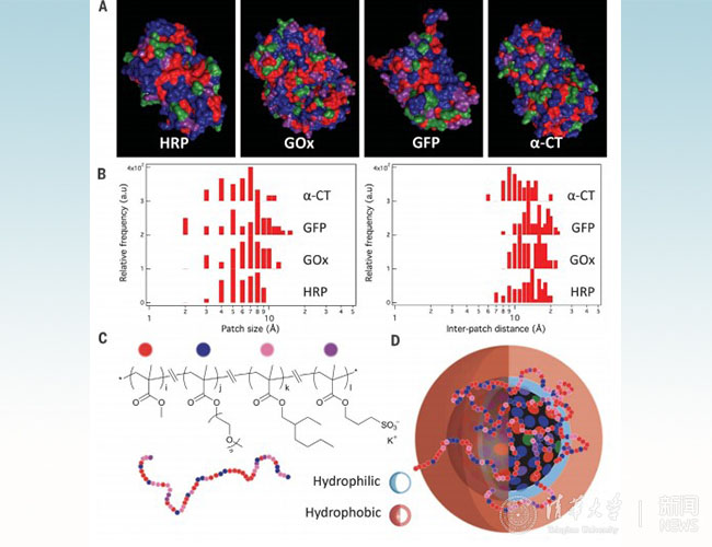 随机异源聚合物 (RHP)是一种无规则杂聚聚合物。在最新研究中,徐婷团队开发出一种由四种单体合成的聚合物材料,每种单体亚单位能与感兴趣的蛋白表面上的化学片段相互作用。这些单体亚单位相互连接模拟天然蛋白,从而使得它们与蛋白表面之间的相互作用的灵活性实现最大化。实验证明,这种材料可以使蛋白质在无细胞合成中进行正确折叠,并保持水溶性蛋白质在有机溶剂中的活性。
