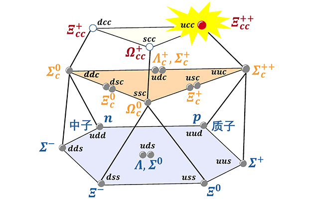 两个粲夸克和一个上夸克组成的双粲重子示意图。