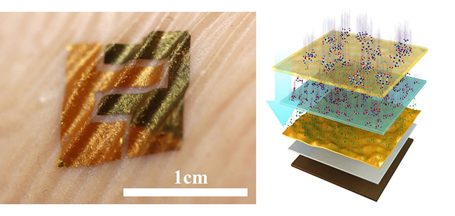 为了实现皮肤表面的微量葡萄糖的精准测量,冯雪课题组结合多年的可延展柔性电子器件研究经验,基于力学原理在1.2微米厚的薄膜上制备了具有四层功能层的类皮肤生物传感器。通过制备器件表面微结构实现了纳米级厚度的电子介体电化学沉积,利用基于液体表面张力和蒸发毛细力的仿生液滴转印方法,将多层超薄生物传感器从制备基底上无损地剥离下来,实现整体厚度只有3.8微米的类皮肤柔性生物传感器的制备。该传感器具有130.4μA/mM的葡萄糖测量灵敏度和对葡萄糖的高度选择性,重复测量误差<1%。