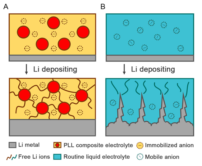 (A)在阴离子固定的柔性复合固态电解质中,锂离子均匀沉积;(B)在阴离子未被固定的常规电解质中,易生成枝晶。