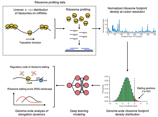 蛋白质翻译是遗传信息从其携带者DNA到执行者蛋白质传递的关键一环,也是分子生物学中心法则的核心环节。在蛋白质翻译的过程中,一种名为核糖体(ribosome)的细胞器会沿着信使RNA链,按照遗传密码子的对应法则依次将核苷酸序列翻译成氨基酸序列,继而形成多肽链。近年来,生物学家们通过各种高通量测序技术测量发现,蛋白质翻译的过程是动态变化的,其中大量存在一种核糖体翻译停滞(ribosome stalling)的现象,这一现象与翻译过程中的蛋白质折叠和定位等一系列重要过程有关。