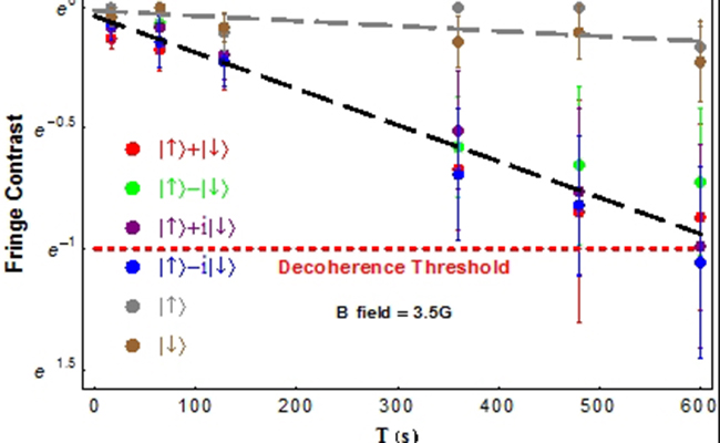 单离子系统相干时间不长的主要原因是加热。在没有激光冷却的环境下,离子被环境噪声加热,从而降低了量子态探测的效率。此项研究在实验中利用协同冷却技术解决加热的问题,用138Ba+离子冷却171Yb+离子(量子比特离子)。由于138Ba+离子拥有和171Yb+离子相似的质量,协同冷却效果显著。又因为138Ba+离子的冷却激光波长距离影响171Yb+量子比特的波长很远,所以协同冷却过程不会影响量子比特的相干性。同时研究组施加了上千个动态解耦操作以抵抗环境的磁场噪声,从而延长相干时间。该研究工作的单量子比特操作保真度达到99.99%。最终研究组制备了6个初始量子态,并测量了它们的相干时间。如下图所示,|↑>和|↓>的相干时间为4,740±1,760秒,其它四个态的相干时间为667±17秒。
