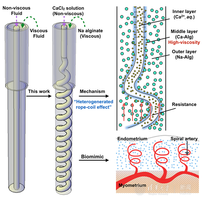 之所以出现这种反常现象,是因为海藻酸钠和氯化钙两相溶液在层流的同时发生着动态的化学反应,两相界面处生成了更高粘度的海藻酸钙水凝胶层并不断增厚(粘度不断增大),当生成的海藻酸钙层超过外相的海藻酸钠溶液并达到一定临界值则会在管内形成螺旋的海藻酸钙通道,而内层同时流动的氯化钙溶液的存在则使得生成的螺旋通道保持中空状态,外层海藻酸钠溶液在进一步与钙离子反应后固化成为海藻酸钙纤维。这种含螺旋通道的水凝胶纤维制备过程不能直接套用简单两相流的“卷绳效应”加以解释。由于微流控两相界面处动态反应生成的异质界面(海藻酸钙)的存在,使得相对粘度发生了动态翻转从而产生了类似“卷绳效应”的螺旋现象,这种现象被称之为“异质生成卷绳效应”(heterogenerated rope-coil Effect)。运用该技术梁琼麟研究组还实现了双螺旋、多螺旋通道以及纤维的三维组装等复杂结构水凝胶材料的制备。所制备的螺旋通道水凝胶纤维具有良好的可灌注能力,可实现极长(米级)水凝胶纤维的血液灌注流通。