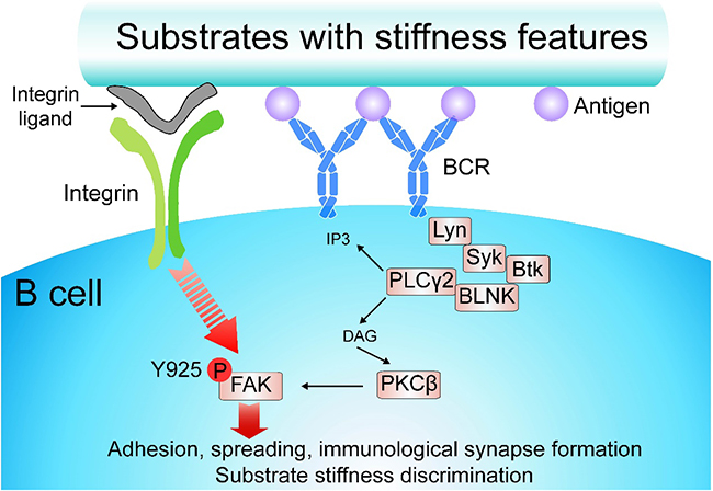 蛋白激酶Cβ(PKCβ)和黏着斑激酶(FAK)协同调控B淋巴细胞的免疫活化对呈递抗原基质硬度的敏感性。