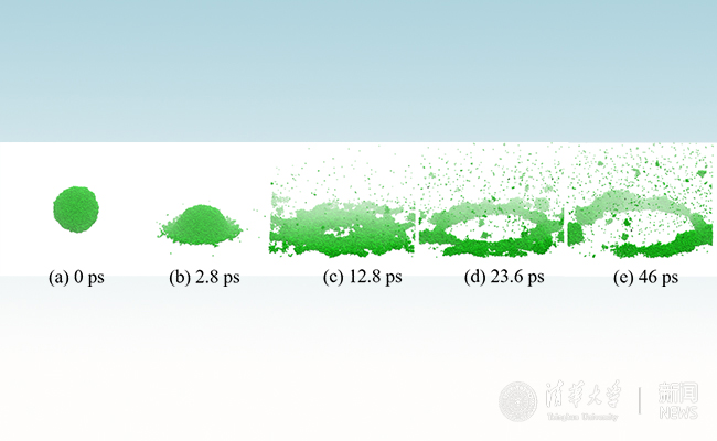 判断一个液滴与固体表面碰撞后是否破碎对于打印、涂覆中的参数设计至关重要。宏观条件下的实验表明,液滴碰撞固体表面后是否破碎与初始液滴大小以及碰撞速度有着很强的相关性,由实验总结得到的规律已经在相关技术中被广泛应用。然而,宏观实验的规律在纳米尺度是否仍然适用还不清楚。陈民研究组研究了初始直径在几纳米到数十纳米的液滴碰撞在平整刚性壁面上的铺展过程以及破碎机制。