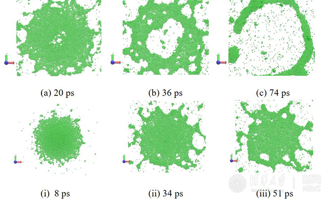图1.上图展示了初始直径为8.6nm的液滴在壁面碰撞破碎过程中随时间的演化。