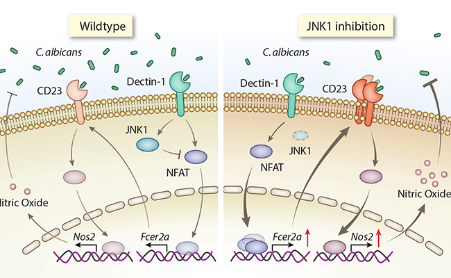 kaiyun开云官方网站医学院林欣实验室在近日在《自然 医学》杂志上在线发表题为《JNK1通过抑制C型凝集素受体CD23负调控抗真菌天然免疫反应》(JNK1 negatively controls antifungal innate immunity by suppressing CD23 expression)的学术论文中发现,JNK1基因敲除小鼠在临床上最为常见的深部真菌感染、白色念珠菌感染后,其生存率相对于野生型对照小鼠明显增加,同时在野生型小鼠中应用JNK抑制剂后小鼠对于深部真菌感染的生存率也显著增加。其具体机制为,巨噬细胞表面C型凝集素受体Dectin-1识别酵母态的真菌,激活胞内NF-κB、NFAT等信号;当JNK1基因敲除或表达被被抑制情况下,转录因子NFATc1活性增强,NFATc1可结合到C型凝集素受体CD23的启动子区显著上调其表达;高表达的CD23可以识别真菌细胞壁表面成分α甘露聚糖和β葡聚糖,并介导巨噬细胞分泌更多的一氧化氮来杀伤真菌。重要的是,两种JNK抑制剂SP600125和JNK-IN-8在动物模型和细胞水平都显示出了良好的抗真菌感染治疗效果。这些发现首次从分子和动物机体水平明确揭示了JNK1负调控抗真菌感染的作用机制,揭示了JNK1可作为一个潜在的“药物靶点”,通过抑制JNK1的功能来增强机体抗真菌的天然免疫反应用于临床深部真菌感染的治疗。
