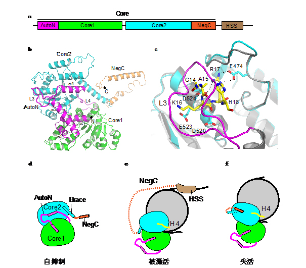 (a) 染色质重塑蛋白(ISWI)的功能元素分布图。(b) “模拟开关”染色质重塑蛋白的整体结构。(c) “模拟开关”染色质重塑蛋白自抑制(灰色)和结合组蛋白H4(青色)的结构比对。 组蛋白H4多肽, 黄色; L3, 洋红色。(d) “模拟开关”蛋白自抑制的概念图。 (e) “模拟开关”蛋白结合带有长接头DNA的核小体的概念图。虚线表示碳端负调控结构域(NegC)处在被拉伸状态。“模拟开关”蛋白被激活,促进染色质重塑发生。(f) “模拟开关”蛋白结合带有短接头DNA的核小体的概念图。此时,碳端负调控结构域(NegC)结合核心结构域(core2),支撑螺旋(Brace helix) 被部分破坏,“模拟开关”蛋白失去活性。