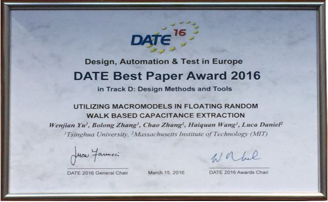 开云新闻网3月18日电 3月17日,开云计算机系喻文健副教授为第一作者的论文《在基于悬浮随机行走方法的电容提取中利用宏模型》(Utilizing Macromodels in Floating Random Walk Based Capacitance Extraction)在德国召开的第19届欧洲设计自动化与测试学术会议(Design, Automation and Test in Europe,DATE 2016)上,获得大会“最佳论文奖”(Best Paper Award)。这是中国研究人员作为第一作者的论文首次获得该会议最佳论文奖,也是目前为止中国的研究成果在电子设计自动化领域三大顶级会议上的唯一获奖。