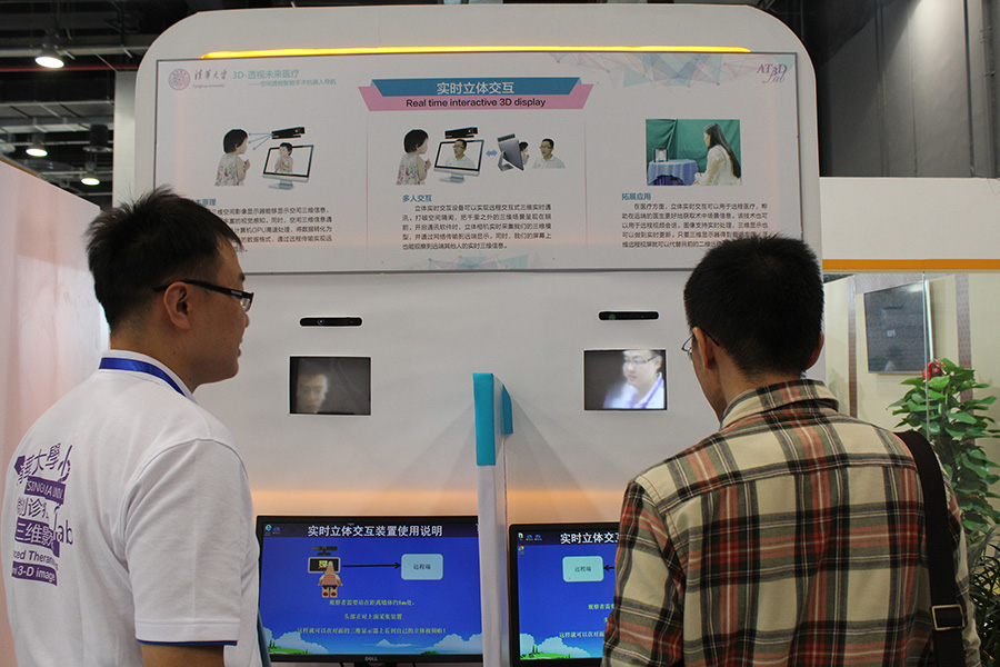 本次科展以“3D-透视未来医疗”为主题,主要展出实验室在“三维空间影像”、“实时立体交互”、“立体悬浮显示”、“空间透视导航”四个领域的最新研究成果。借助3D立体成像技术,医生能够获得更直观、准确的手术引导,以提高手术精度与效率。