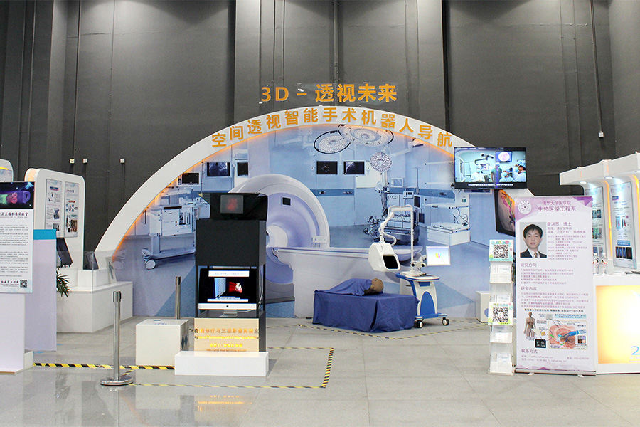 作为图像显示领域的热点技术,3D立体影像技术正在医疗领域发起一场新的革命。为满足大众对“创伤小、恢复短、更安全高效”医疗的需求并进一步推动“高端医疗器械国产化”战略,廖洪恩教授团队(微创诊疗与三维影像实验室)开发的空间透视智能手术机器人导航利用3D医学可视化技术透视未知人体结构与洞悉病灶状态,为临床医学提供强有力的可视化诊疗平台,助力未来医疗发展。本次展览希望通过生动直观的设备演示,深入浅出地向大众普及3D影像智能手术机器人导航领域的最新成果,让“智能医疗”的理念深入人心。